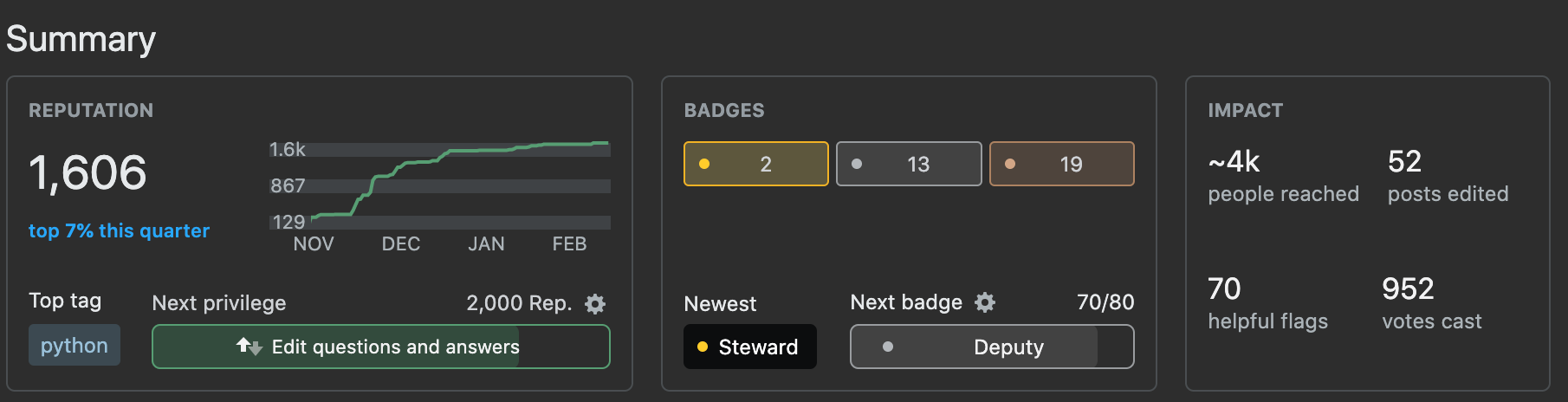 근 몇개월간 스택오버플로우를 통해 여러 QA를 작성한 결과, 현재까지 1600점에 해당하는 reputation을 쌓을 수 있었습니다. Reputation이 100점, 200점, .. 1000점을 달성할때 마다 레벨업을 할 때마다 느끼는 성취감을 포함해서, 실제 업무에서 reputation을 쌓으면서 얻은 디버깅 능력과 문제 해결능력을 통해, 좀더 좋은 코드를 구현 할 수 있는게 실제로 와닫기도 했습니다. 그리고 커뮤니티에 기여를 많이 할 수록, 메달을 주기도 하는데 지금까지 2개의 금매달 13개의 은매달, 19개의 동매달을 획득하고 매달이 늘어날때 마다 뭔가 뿌듯함을 느낄 수 있는 계기가 된것 같습니다.