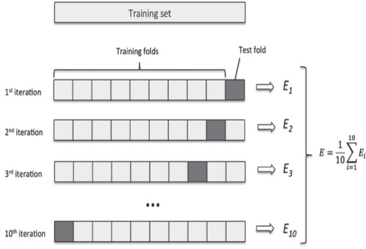 K-fold는 데이터셋을 k개의 그룹으로 나눠 사용하는 교차 검증입니다. 분리된 k개의 그룹 중 한 그룹만 k-1을 학습데이터로 사용 하여 k개의 모델을 추정하는 방식으로써, k값이 10인 10-fold 방식의 경우 전체 자료를 10등분 한 후에 9등분을 학습에 사용하고 나머지 한 등분을 평가에 사용 합니다. 그리고 이 과정을 10번 반복한 후, 그 평균을 내어 각 학습모델을 평가하는 기법입니다. K-fold의 교차검증은 다음과 같이 이루어 집니다 :