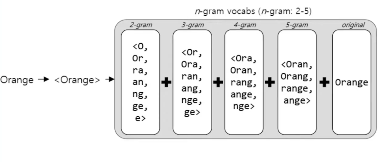 위의 그림을 살펴보면 Orange라는 단어가 주어졌을때 <orange>에 대해 n-gram에 대한 모든 경우의 수로 나타내면 총 n=2 부터 5까지로 나타나게 됩니다. 여기서 n이 2일때 ~ 5일때 까지의 n-gram의 경우의 수를 모두 더한값을 orange에 대한 하나의 백터로 사용하게됩니다.