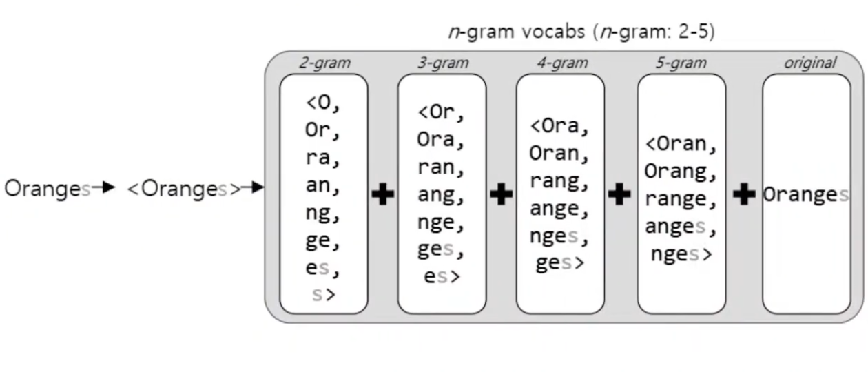 위의 그림을 살펴보면 Orange라는 단어가 주어졌을때 <orange>에 대해 n-gram에 대한 모든 경우의 수로 나타내면 총 n=2 부터 5까지로 나타나게 됩니다. 여기서 n이 2일때 ~ 5일때 까지의 n-gram의 경우의 수를 모두 더한값을 orange에 대한 하나의 백터로 사용하게됩니다.