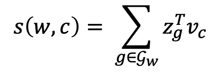 여기서 g의 경우는 n-gram의 dictionary의 사이즈를 의미하고, gw는 단어 w에서 나올 수 있는 모든 n-gram의 경우의 세트이며, z는 n-gram의 각각 vector representaiton입니다.