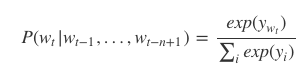 - NPLM의 밑부분 출력은 $|v|$ 차원의 score vector $y_{w}$에 softmax 함수를 적용한 $|v|$ 차원의 확률 벡터라고 합니다. 이때 $y_{wt}$는 다음과 같이 정의 됩니다