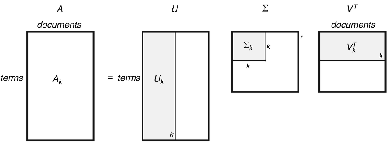 LSA는 turncated SVD 방식을 적용하여 차원축소를 진행한 방식입니다. 위의 그림을 보면 어떠한 데이터 A가 주어져있을때, 특이값 분해(singular value decomposition; SVD)로 r개의 교유값을 갖는 성분으로 분해가 가능하며