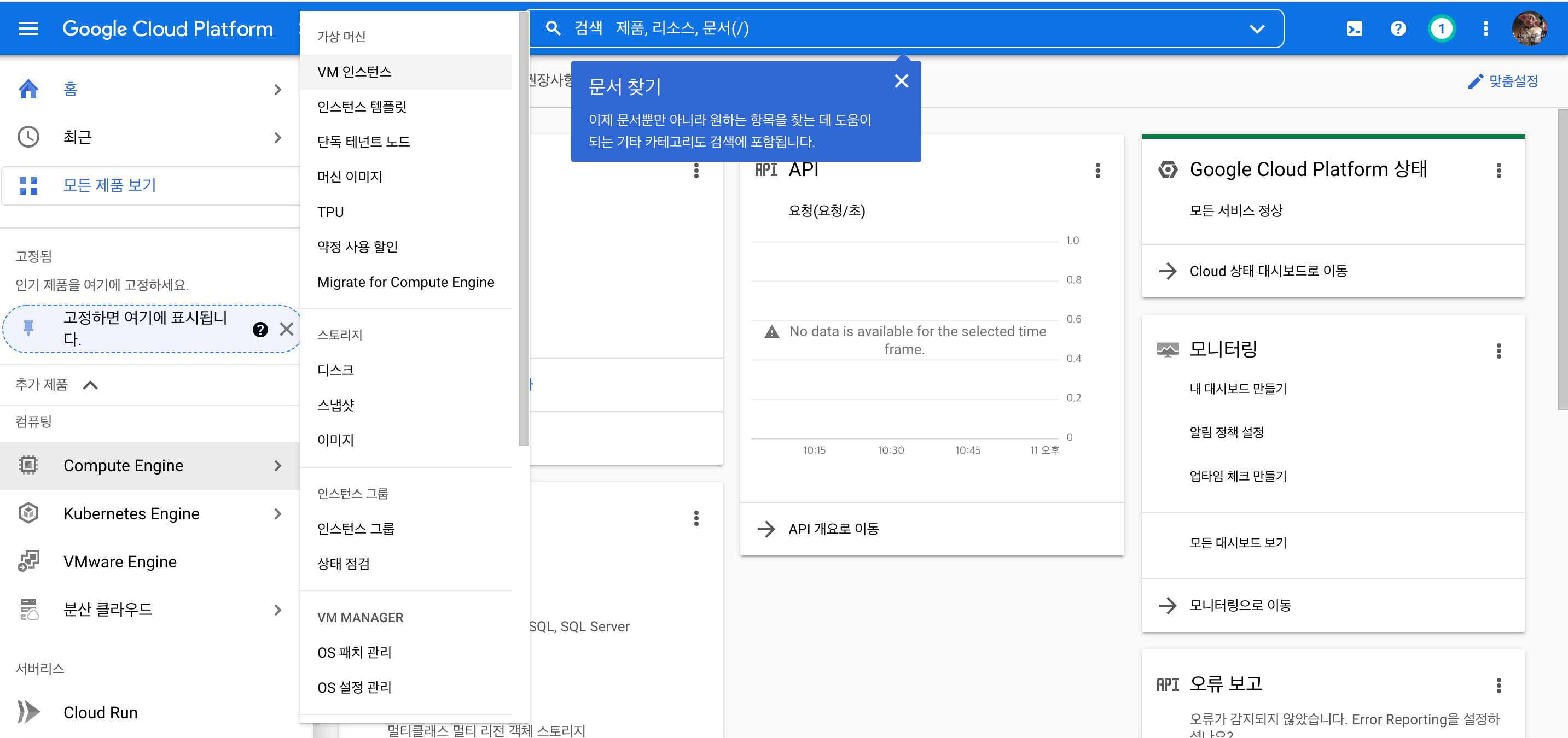 먼저, 왼쪽 메뉴에서 Compute Engine -> VM인스턴스를 클릭해 줍니다.