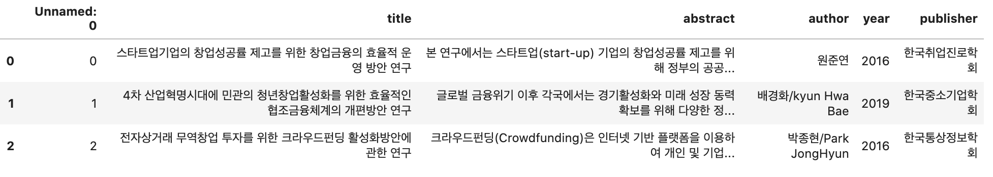 이제 데이터를 불러와줍니다. 해당 데이터는 KCI 내 창업금융을 키워드로 크롤링을 진행하였습니다.