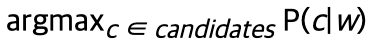 Call correction(w)은 w에 대해 가장 가능성이 높은 맞춤법 수정을 선택하려고 시도합니다. 하지만 확실히 알 수 있는 방법은 없습니다. 예를들어, "late"를 "late", "latest" 또는 "lattes"으로 수정해야 하기때문입니다. 따라서 가능한 모든 후보 중에서 원래 단어 w가 주어졌을 때 c가 의도한 수정일 확률을 최대화하는 수정 c를 찾으려고 합니다.