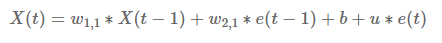 ARMA의 같은경우 Autoregressive 와 moving average를 합친것으로 현재 시점의 상태를 파악하는 과거 시점의 자기 자신과 추세까지 전부 반영하여 예측을 진행하는 모델이라고 생각 할 수 있습니다. 이를 식으로 표현하면 아래와 같이 나타낼 수 있습니다.