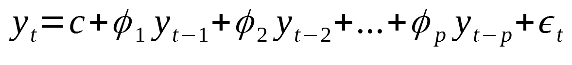 여기에서 는 백색잡음(백색잡음은 평균이 0이고 분산이 일정한 상수(σ2)인 정규분포를 따르며, 시간에 흐름에 따른 다른 백색잡음들과 correlation이 0인 잡음)입니다. 의 시차 값을 예측변수(predictor)로 다루는 것만 제외하면 다중 회귀처럼 생겼습니다.