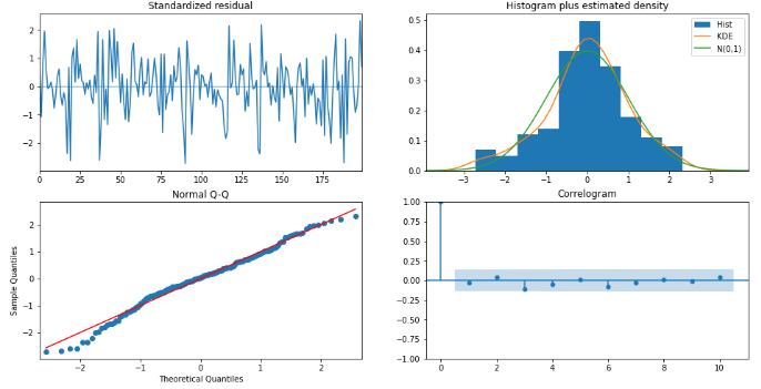 모델에 대한 결과값을 plot_diagnostics()를 통해 얻은 잔차 그래프로도 확인해보겠습니다.