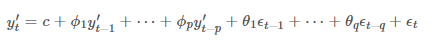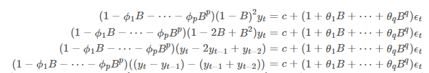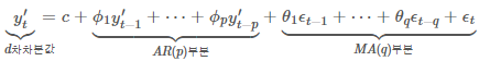 여기서 y'은 차분을 구한 시계열이며, p차 까지 AR처럼 과거의 y'값이 들어가 있으며, q차까지 MA처럼 ϵt가 전개되어있습니다. 즉, p는 AR 부분의 차수를 의미하며, d는 차분의 정도, 그리고 q는 MA부분의 차수라고 정의 할 수 있습니다. 만일 ARIMA(1,0,0) 이면 AR(1) 모형과 같으며 ARIMA(0,0,1) 이면 MA(1) 모형이 될 수 있습니다. 따라서, ARIMA(p,d,q) 모형은 어떤 시계열 데이터를 d차 차분을 했을 때, AR(p) 모형과 MA(q) 모형이 합쳐진 ARMA(p,q) 모형을 따르는 형태 입니다.