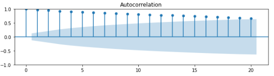 먼저 해당 데이터를 보면 정상성은 만족하지 않는다고 의심을 할 수 있습니다.이를 판단하기위해 ACF(자기상관함수, AutoCorrelation Function)를 통해 확인해 보았습니다.
