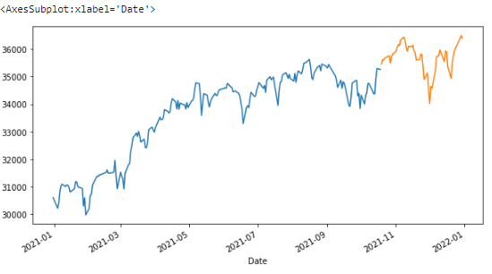 다우지수의 2021년 1월 부터 12월까지의 시계열 데이터중 시초가(Open)를 확인해 보겠습니다. 그리고 시계열 예측을 위해 8:2의 비율로 데이터를 분류해 주었습니다.
