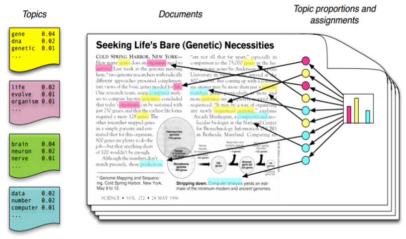 해당 그림에서 토픽은 총 4가지(노란색, 붉은색, 초록색, 파란색)으로 나타나며, 노란색토픽이 가장 많은 단어들을 내포하고 있음을 알 수 있습니다. 또한, 노란색 토픽의 경우 gene, dna, genetic과 같은 단어들로 이루어지고 각각 단어의 등장 확률은 0.04, 0.02, 0.01로 나타나는 것을 확인 할 수 있습니다. 이를 통해 해당 문서에서의 메인 토픽은 노란색 토픽이며, 노란색 토픽은 유전자에 관한 토픽이다 라고 유추할 수 있습니다.