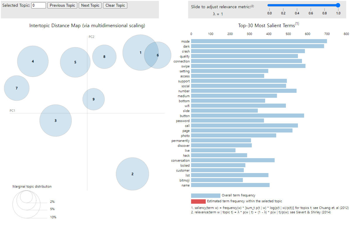 Coherence score를 통해 최적의 토픽을 찾아본결과 토픽의 갯수가 9개로 구성되었을시 토픽의 분포 및 토픽내 단어들이 해당 토픽을 가장 잘 설명해 주는것으로 확인되었습니다.