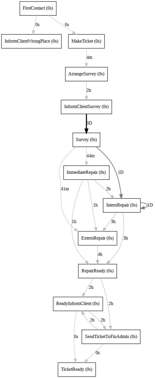 - FirstContact → MakeTicket → ArrangeSurvey → InformClient → Survey → ImmediateRepair or InternRepair or ExternRepair → RepairReady → SendTicektToFinAdmin → ReadyInformClient → TicketReady로 이루어 짐을 확인할 수 있습니다.