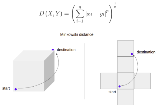 Minkowski distance는 euclidean distance와 Manhattan distance의 일반화라 볼 수 있습니다. Minkowski 미터법 p의 차수에 대한 절대 차이를 기반으로 거리를 계산하는 방법입니다. p > 0에 대해 정의되지만 1, 2 혹은 무한대 이외의 값에는 거의 사용되지 않습니다. Minkowski distance는 p=1일 때 Manhattan distance와 같고, p=2일 때 euclidean distance와 같습니다.