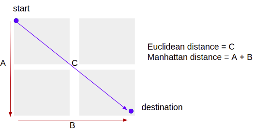 Manhattan distance는 두 점의 모든 차원에서 측정값 간의 절대 차이의 합입니다. 그 차원이 2이면 한 블록을 걸을 때 오른쪽과 왼쪽을 만드는 것과 유사합니다.