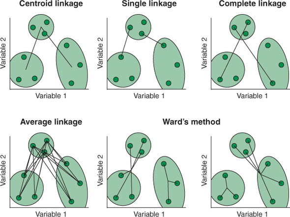 Single은 각 클러스터내 데이터 사이의 가장 짧은 거리를 통해 계산하는 방식입니다. 즉, 가장 비슷한 두 데이터의 거리를 두 클러스터의 거리로 정의합니다. Complete는 각 클러스터내 가장 긴 거리를 두 클러스터간 거리로 생각하여 가장 비슷하지 않은 두데이터의 거리를 클러스트간의 거리로 판단하는 방식입니다. Average는 클러스터내 모든 데이터의 거리의 평균을 두 클러스터 사이의 거리로 판단합니다. Centroid의 경우 각 클러스터의 중앙값 사이의 거리를 두 클러스터간의 거리로 판단합니다.