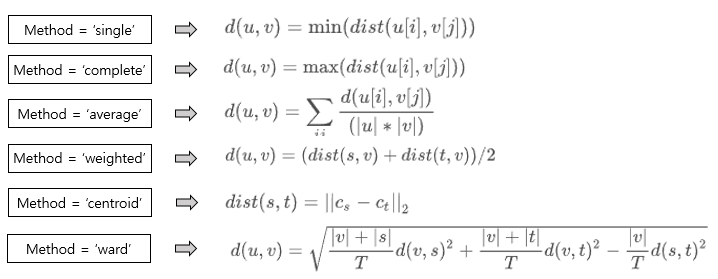 먼저 y의 경우 인풋값으로 1-D나 2-D의 백터형태로 들어갑니다. 즉, 클러스터링을 진행하고자 하는 데이터의 인풋에 대한 파라미터입니다. 이후 method는 새로 형성된 클러스터와 각각의 클러스터 사이의 거리를 계산하는 방법에 대한 파라미터 입니다. 즉, K-means와 같이 거리를 설정할 수 있는 파라미터라 이해하면 될것같습니다. 거리는 크게 single, complete, average, 그리고 weighted로 나누어집니다.