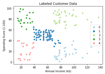 따라서, Annual Income과 spending score로 구성된 두 산점도를 scatterplot을 사용하여 확인해 보았으며 총 5개의 그룹이 구성된다고 유추 할 수 있습니다