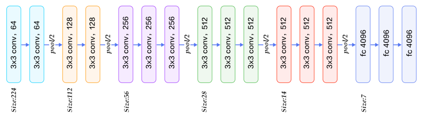 CNN기반인 AlexNet이 좋은 성과를 내면서 더욱 발전된 후속 모델들이 나왔습니다. VGGNet는 모델의 제목에서 유추할수 있듯이 모델의 lyaer를 많이 쌓을 수록 CNN 모델의 성능에 어떠한 영향을 미치는지에 대해 집중하여 ILSVRC에서 준우승을 차지한 모델입니다.